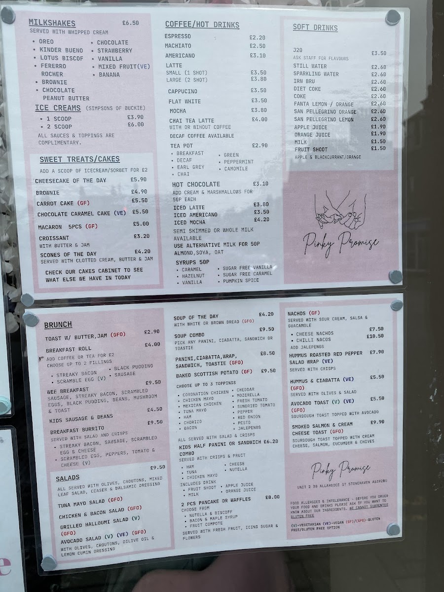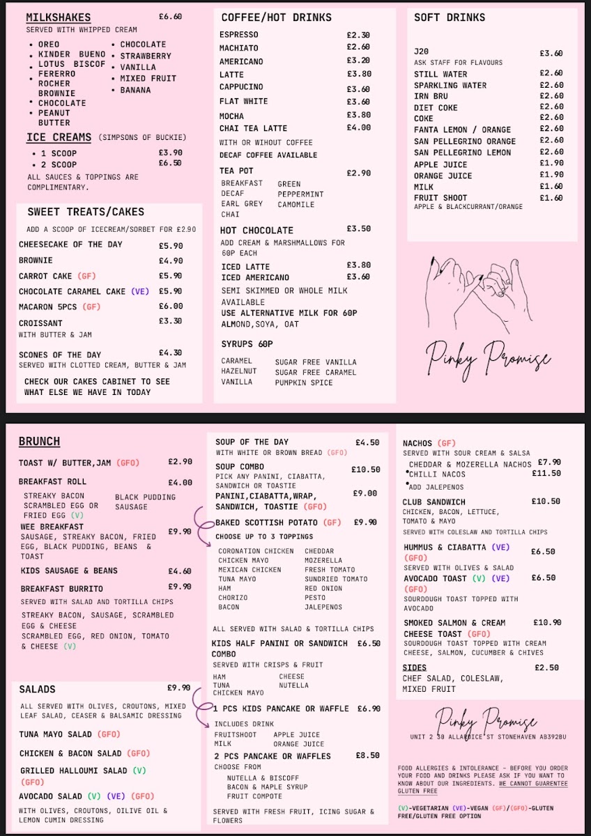 Welcome to PINKY PROMISE CAFÉ, a hidden gem nestled in the heart of Stonehaven. This charming café offers a cozy ambiance perfect for catching up with friends or enjoying a quiet moment alone. Diners rave about the quality of the coffee, particularly the expertly crafted lattes, which are described as rich and robust. The menu features delightful options, from freshly baked scones to divine pancakes that leave guests longing for more.
